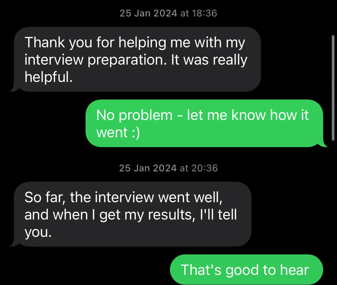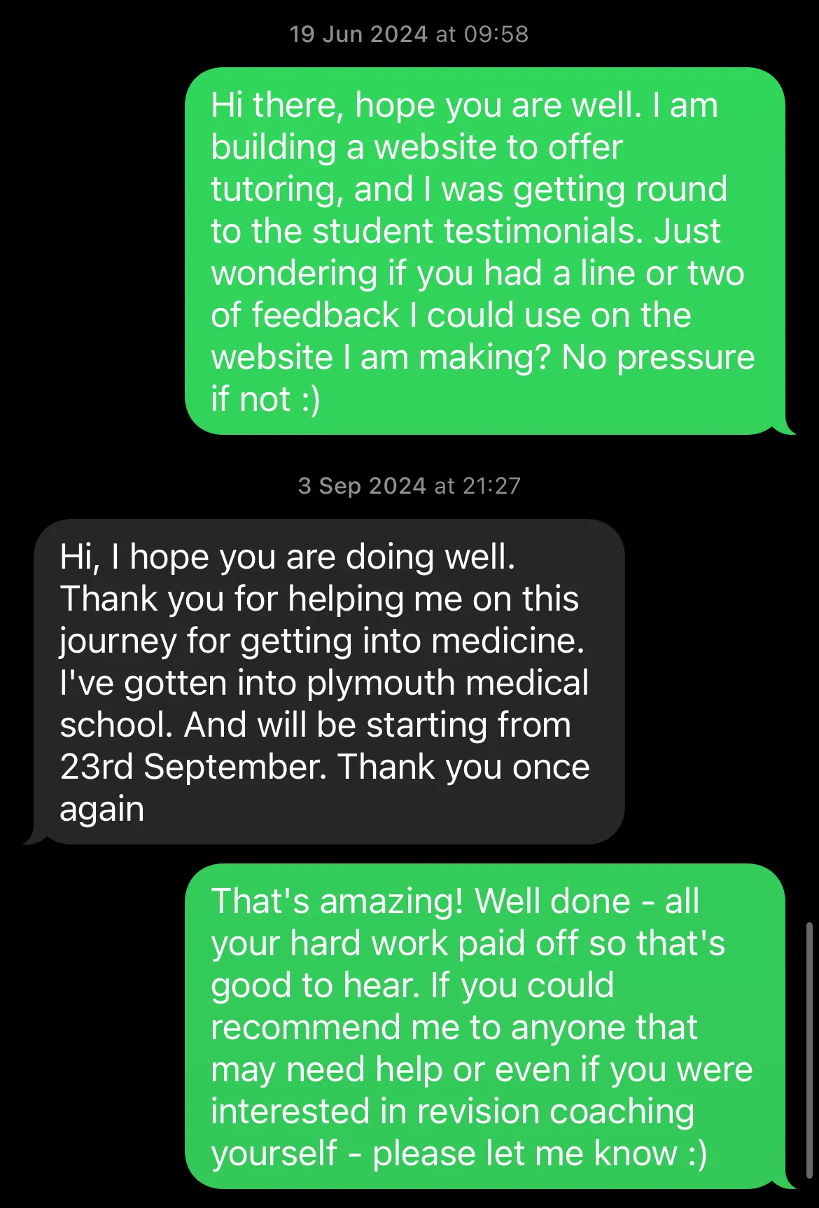 Additionally, 100% of my students preparing for medical interviews and entrance exams have gone on to study medicine.